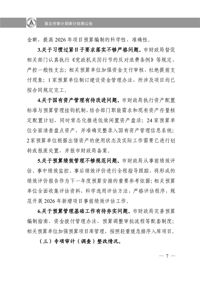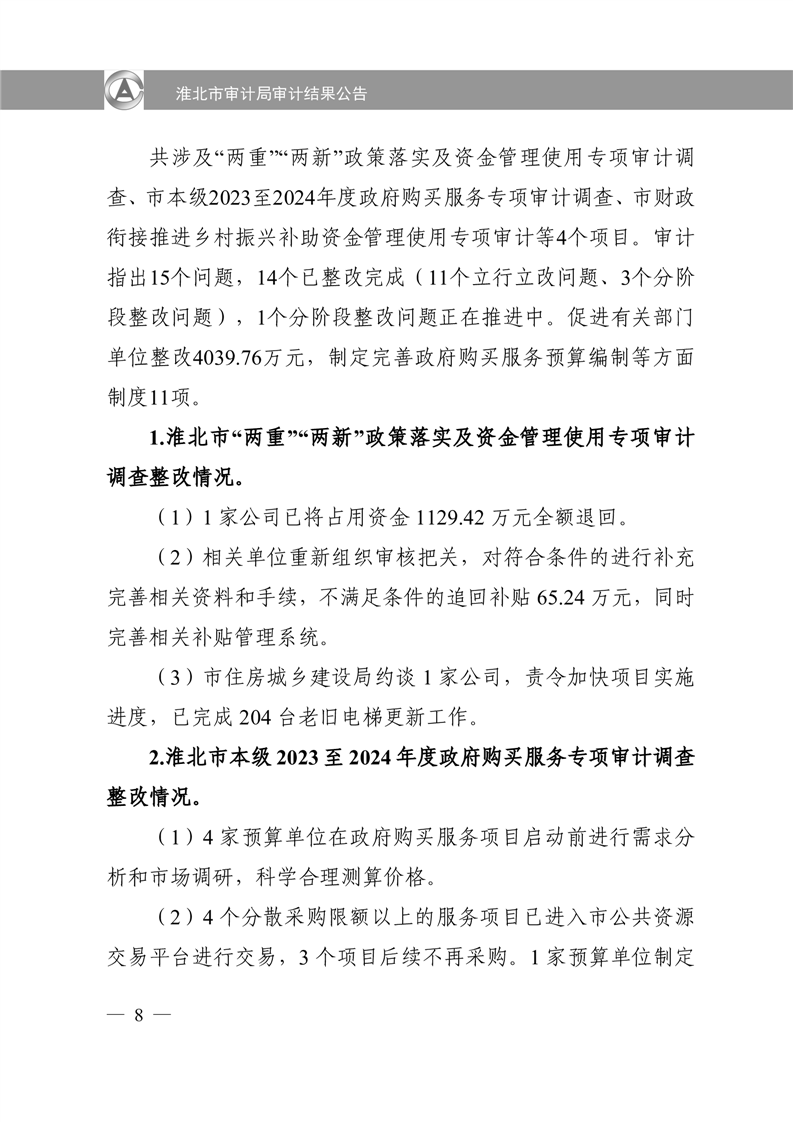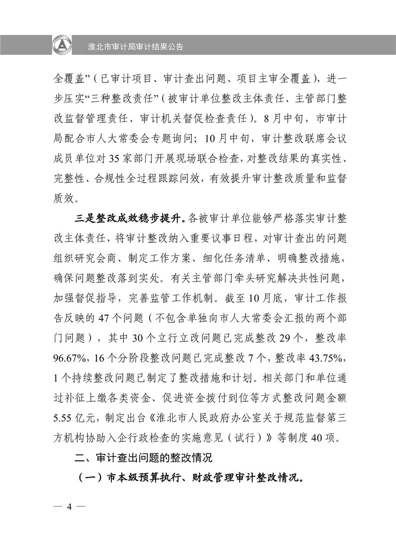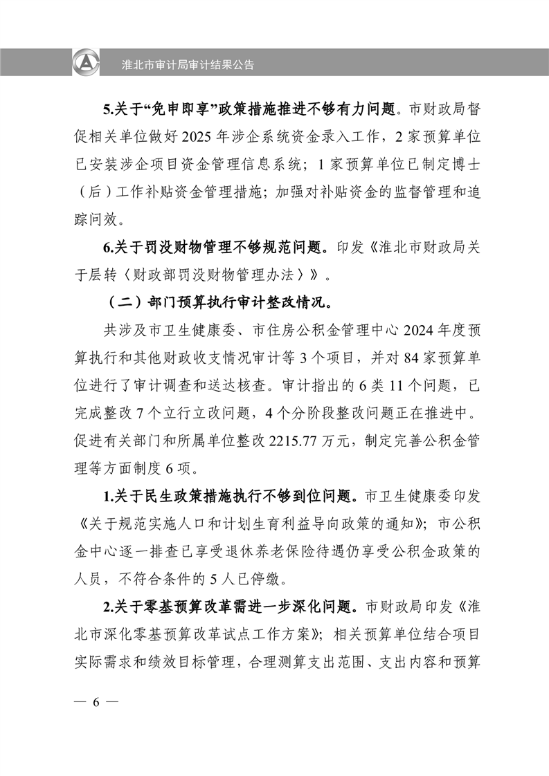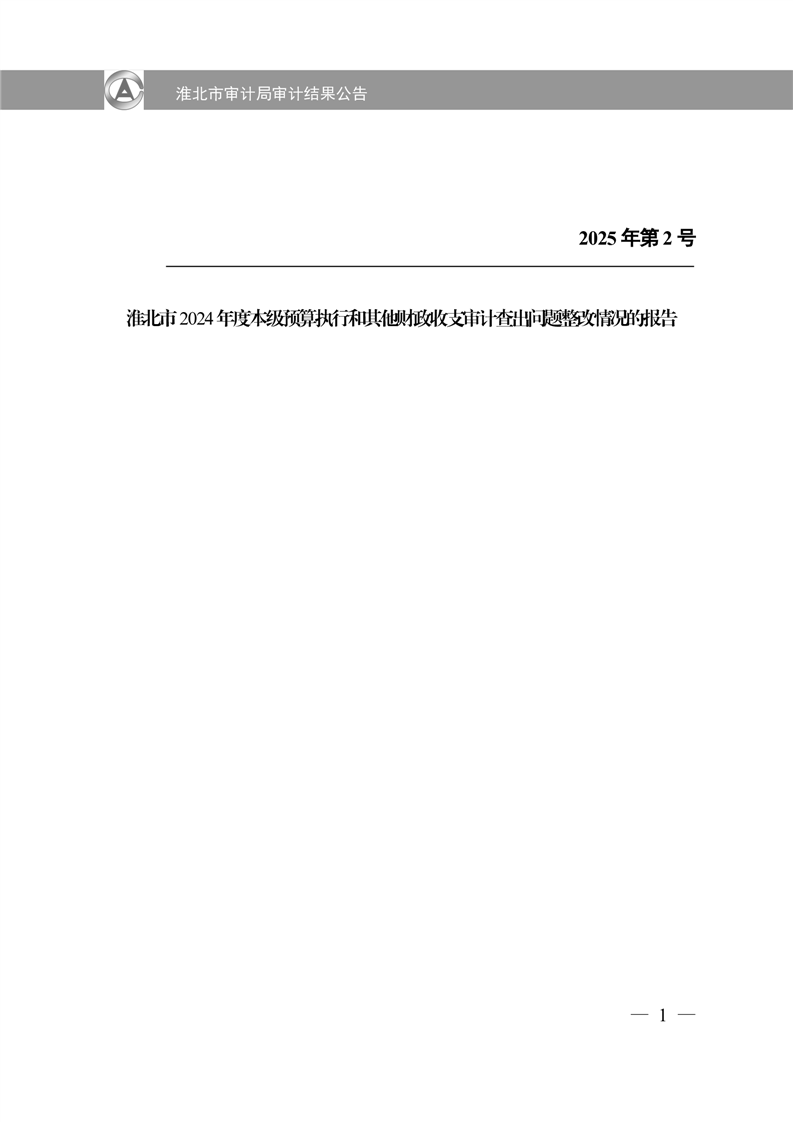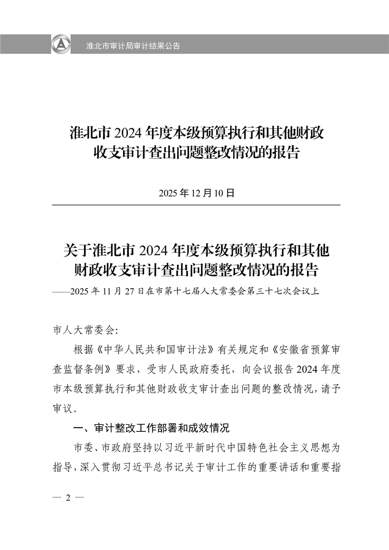 淮北市审计局审计结果公告2025年第2号:淮北市2024年度本级预算执行和其他财政收支审计查出问题整改情况的报告