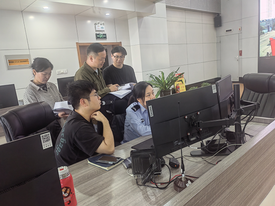(图为审计组现场查看智能交通指挥调度系统使用绩效情况)